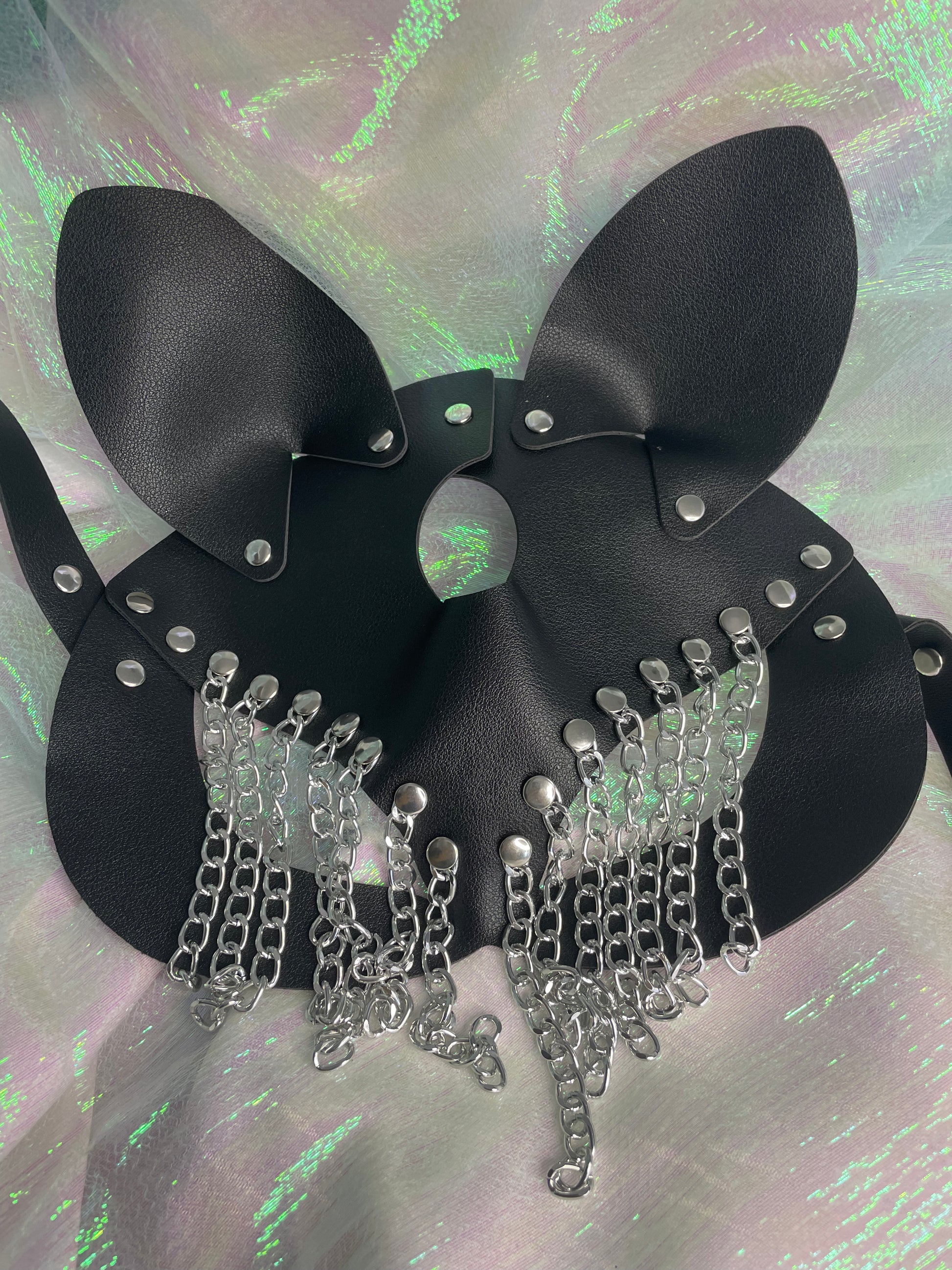 Mask made with vegan leather and silver details. ONE SIZE